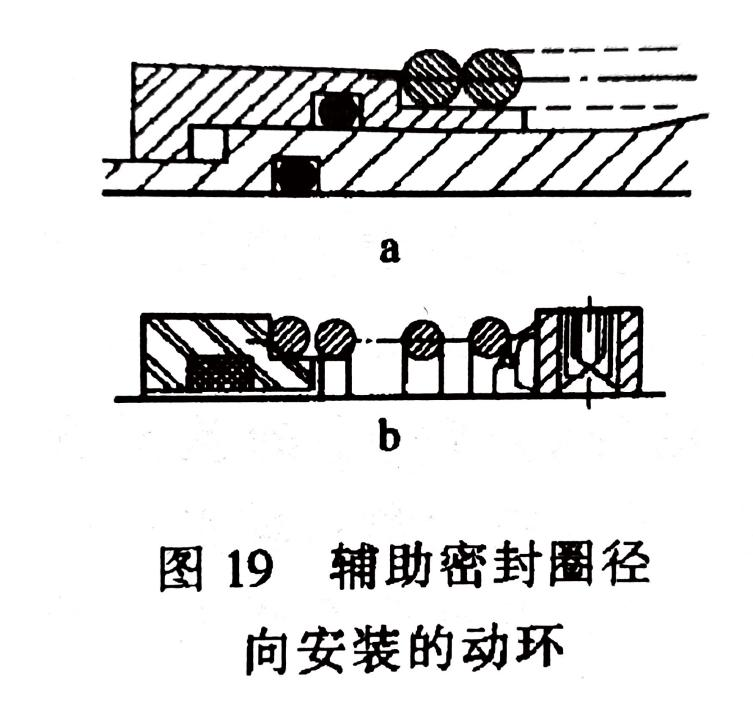 輔助密封圈徑向裝置的動(dòng)環(huán)(圖19),靠密封圈的過(guò)盈和彈性實(shí)現(xiàn)密封,其材質(zhì)大多采用聚四氟乙烯和合成橡膠。伴隨使用時(shí)間變長(zhǎng),這兩種材質(zhì)分別呈現(xiàn)冷流變形和老化而失去彈性。有文獻(xiàn)記載,這種結(jié)構(gòu)的密封,有40%的失效發(fā)生在輔助密封圈位置。