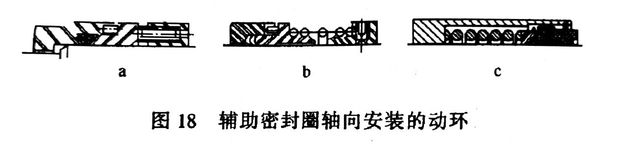 靠輔助密封圈軸向裝置的動(dòng)環(huán)(圖18),靠彈簧力壓緊密封圈來(lái)實(shí)現(xiàn)密封。彈簧力可視為不變化,密封可靠、使用壽命長(zhǎng)、安裝較為便利,從而得到廣泛應(yīng)用。