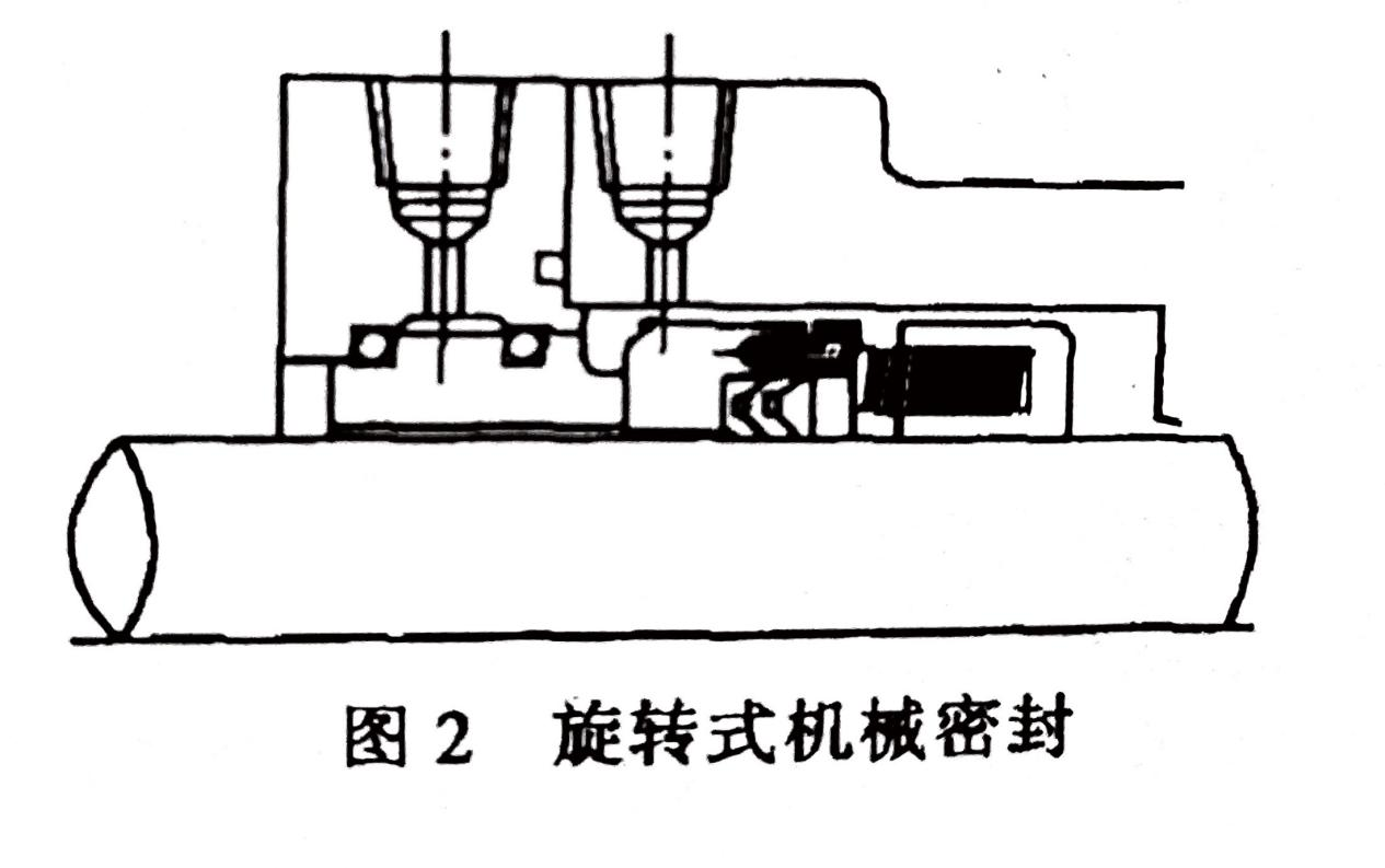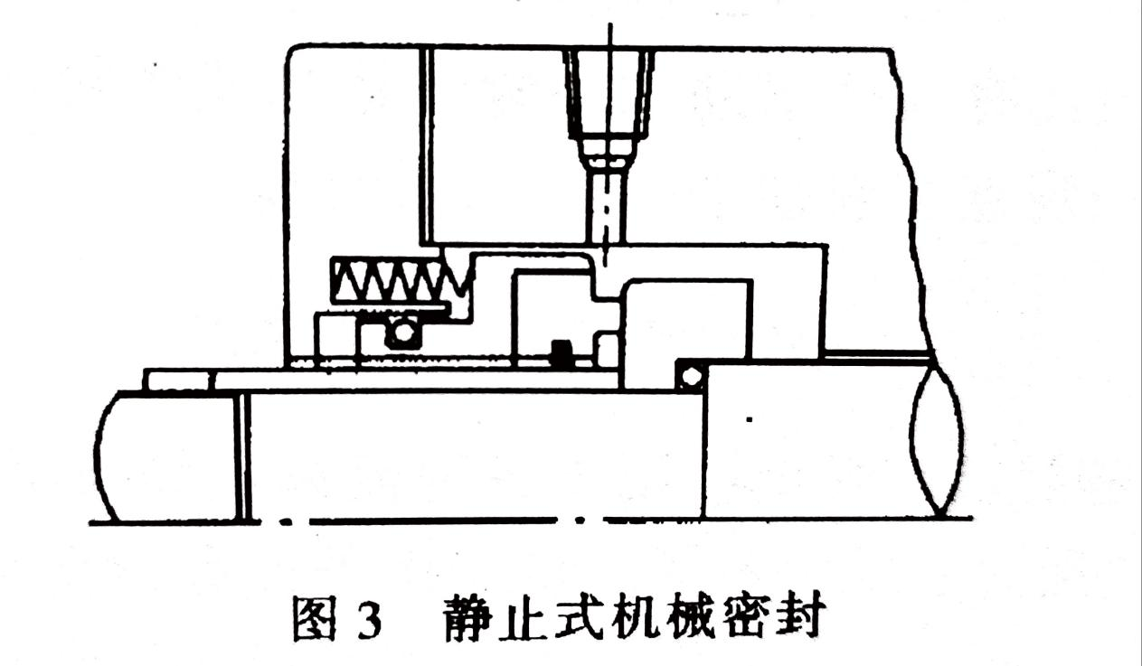 按補(bǔ)償結(jié)構(gòu)彈性元件的運(yùn)動情況,可以分為旋轉(zhuǎn)式和靜止式機(jī)械密封。補(bǔ)償結(jié)構(gòu)隨軸旋轉(zhuǎn)的稱為旋轉(zhuǎn)式機(jī)械密封(圖2);補(bǔ)償結(jié)構(gòu)不旋轉(zhuǎn)的(安裝在壓蓋內(nèi))稱為靜止式機(jī)械密封(圖3)。補(bǔ)償結(jié)構(gòu)旋轉(zhuǎn)時(shí)易發(fā)生質(zhì)量不平衡,同時(shí)消耗攪拌功率,因此,旋轉(zhuǎn)式密封不能用于高速;而靜止式密封可用于高速??墒切D(zhuǎn)式密封安裝較方便,所以,普通的機(jī)械密封大多選用旋轉(zhuǎn)式結(jié)構(gòu)。