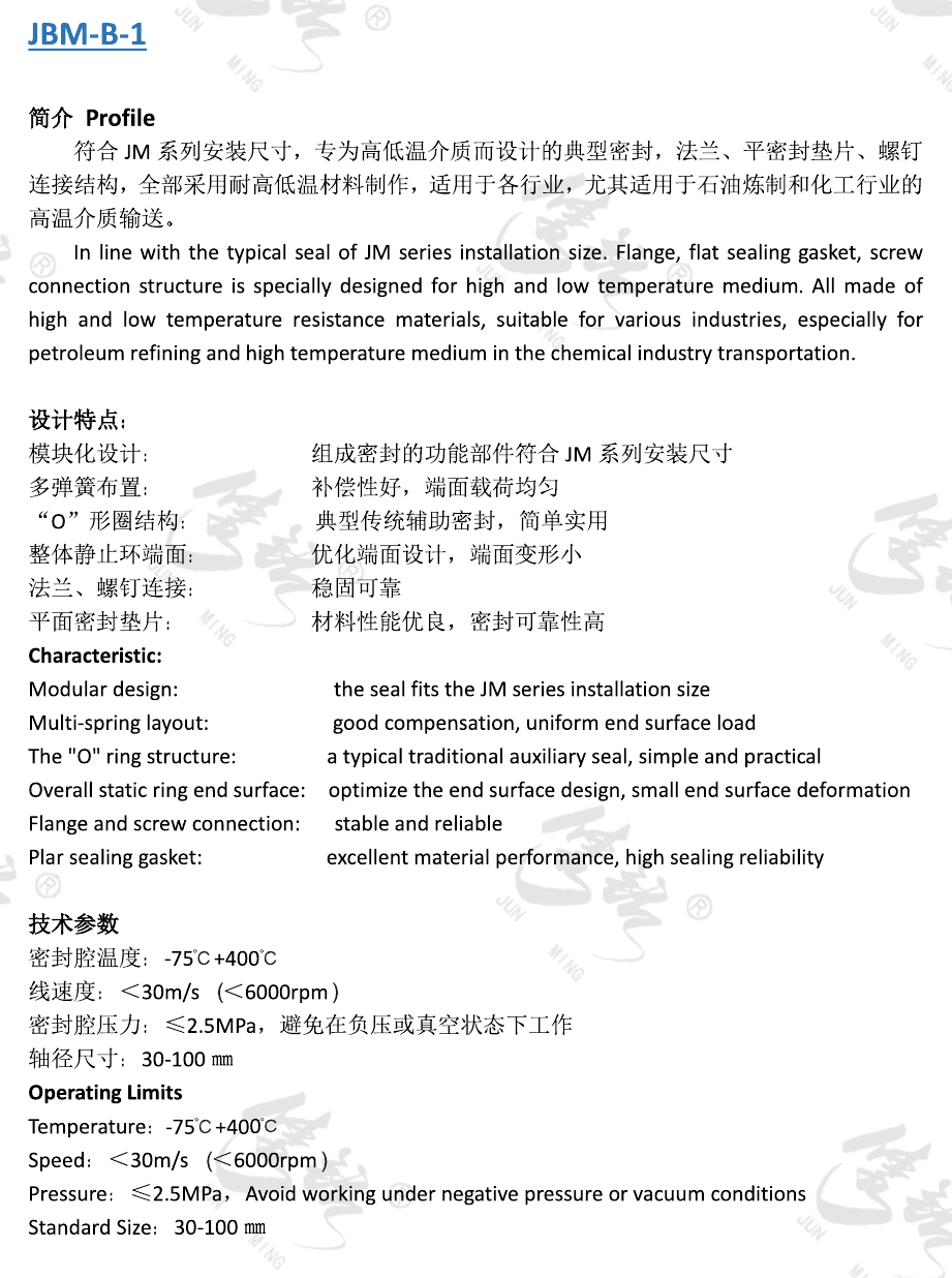 符合JM系列安裝尺寸,專為高低溫介質(zhì)而設(shè)計的典型密封,法蘭、平密封墊片、螺釘連接結(jié)構(gòu),全部采用耐高低溫材料制作,適用于各行業(yè),尤其適用于石油煉制和化工行業(yè)的高溫介質(zhì)輸送。