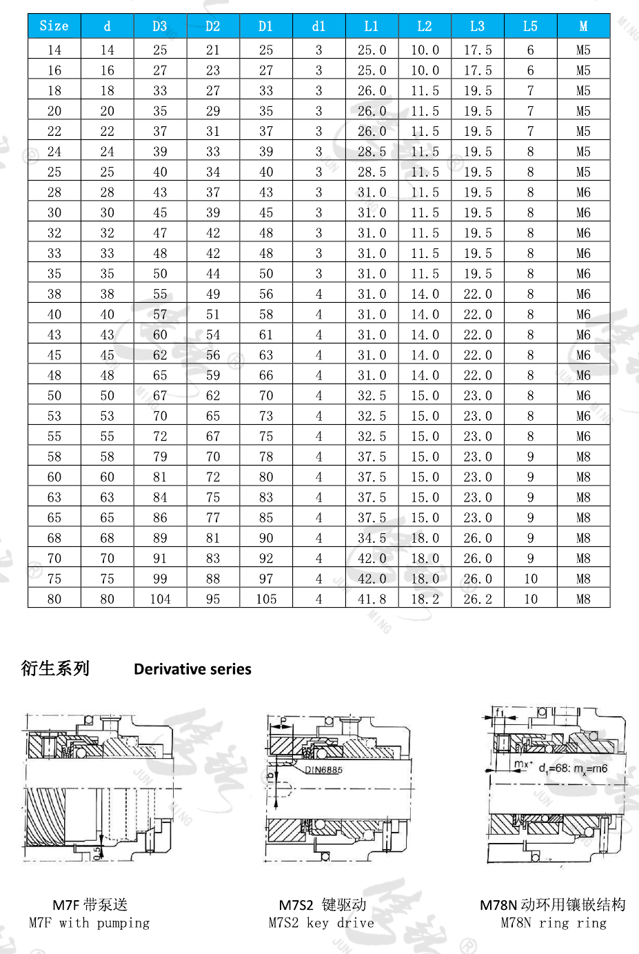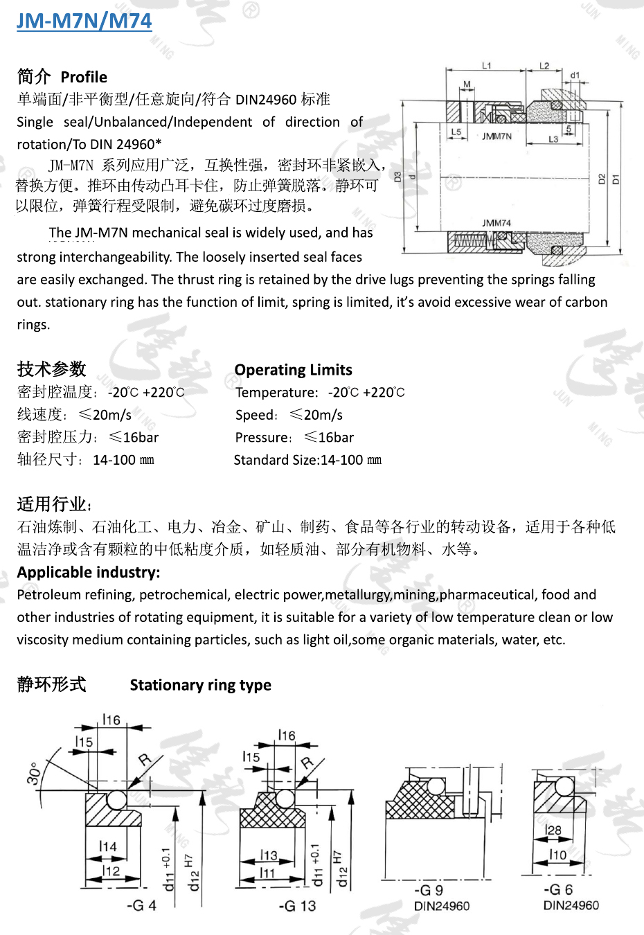 M7N系列應(yīng)用廣泛,互換性強(qiáng),密封環(huán)非緊嵌入,替換方便。推環(huán)由傳動搭子卡住,防止彈簧脫落。靜環(huán)可以限位,彈簧行程受限制,避免碳環(huán)過度磨損。