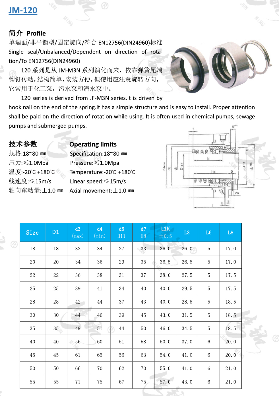 120系列是從JM-M3N系列演化而來(lái),依靠彈簧尾端鉤釘傳動(dòng),結(jié)構(gòu)簡(jiǎn)單,安裝方便,但使用應(yīng)注意旋轉(zhuǎn)方向,它常用于化工泵,污水泵和潛水泵中。