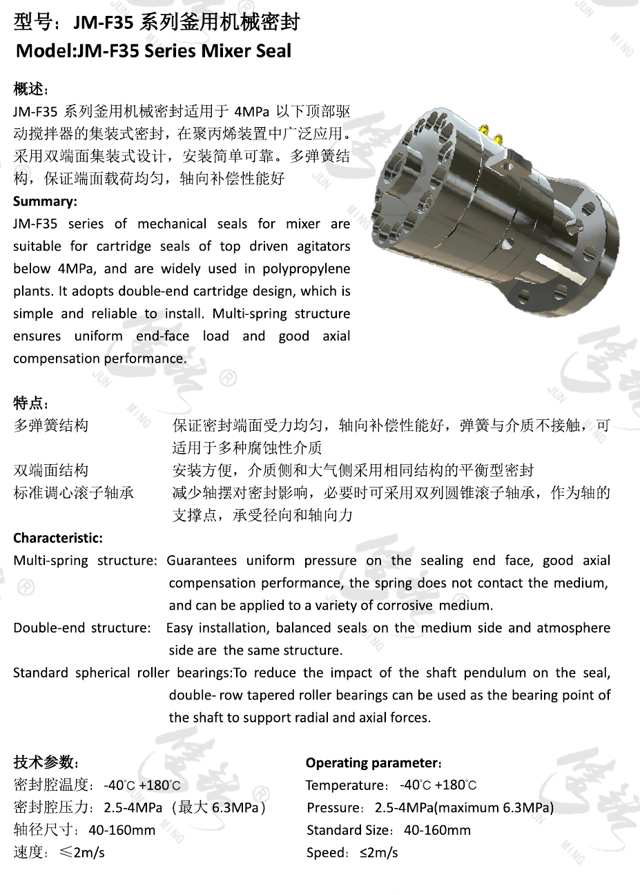 JM-F35系列釜用機(jī)械密封適用于4MPa以下頂部驅(qū)動攪拌器的集裝式密封,在聚丙烯裝置中廣泛應(yīng)用。采用雙端面集裝式設(shè)計(jì),安裝簡單可靠。多彈簧結(jié)構(gòu),保證端面載荷均勻,軸向補(bǔ)償性能好