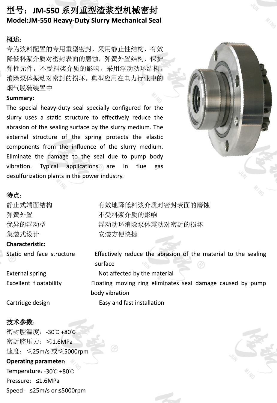 專為漿料配置的專用重型密封,采用靜止性結構,有效降低料漿介質對密封表面的磨蝕,彈簧外置結構,保護彈性元件,不受料槳介質的影響,采用浮動動環(huán)結構,消除泵體振動對密封的損壞。典型應用在電力行業(yè)中的煙氣脫硫裝置中