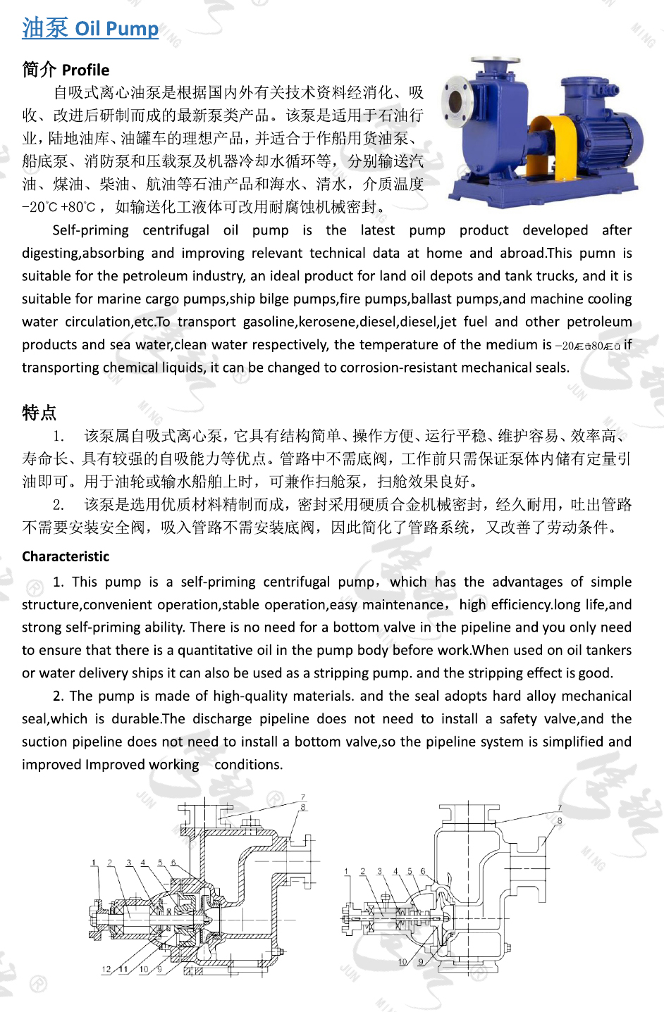 自吸式離心油泵是根據(jù)國(guó)內(nèi)外有關(guān)技術(shù)資料經(jīng)消化、吸收、改進(jìn)后研制而成的最新泵類產(chǎn)品。該泵是適用于石油行業(yè),陸地油庫(kù)、油罐車(chē)的理想產(chǎn)品,并適合于作船用貨油泵、船底泵、消防泵和壓載泵及機(jī)器冷卻水循環(huán)等,分別輸送汽油、煤油、柴油、航油等石油產(chǎn)品和海水、清水,介質(zhì)溫度-20℃+80℃,如輸送化工液體可改用耐腐蝕機(jī)械密封。